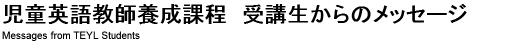児童の教育に携わった事がない私が、また、児童と接すること自体にクリアな自分の在るべき姿が見えない私が、このコースで理論的な事も実践的な事もいろいろな角度から学習することが出来て、少し具体的な自分の姿が見えた気がしました。まず教師として一番大切な事は、教える事や人と接する事が心から好きな事だと思います。この研究所の先生方は、皆さん教えたり人と接することが好きなんだなと、その態度や表情からよく分かります。だからきっと子どもたちもそういう事は大人よりももっと察すると思うのです。教師がいつも一生懸命まっすぐ前を向いて教える事に喜びを感じていれば、その心は必ず子どもたち・学習者の心に響くものと思います。私は今まだ児童を教えるか、中・高校生を教えるのか決めていませんが、いずれにしても英語のスキル、そして、人間として成長しようという向上心を忘れることなく心豊かな教育ができる人に成りたいと思います。