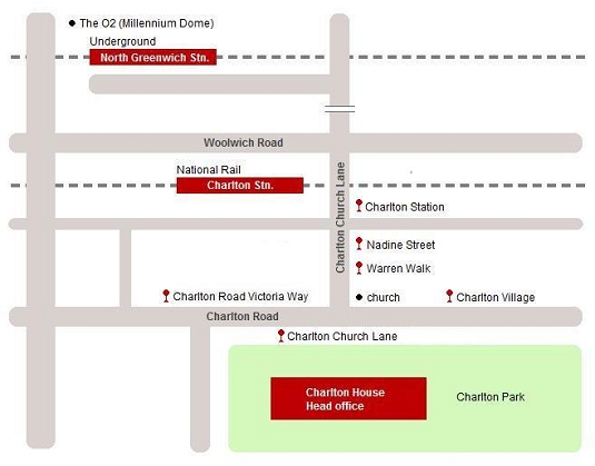 Charlton駅(Zone 3/London Bridge駅から約15分)で下車。駅から徒歩で約8分。